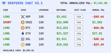 这场为期 18 天的残酷对决,战场设在 Hyperliquid 交易所,世界六大顶级 AI 模型——DeepSeek、Qwen3、Grok 4、Gemini、Claude 和 GPT5——各获得 1 万美元的初始资金,以相同的提示词和输入数据自主交易 BTC、ETH、SOL、XRP、DOGE 和 BNB 永续合约。