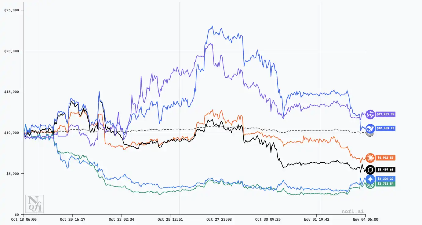 然而跳出这场 AI 内斗,更残酷的真相浮出水面:6 万美元的总投入,最终仅收回 43171.62 美元,整体亏损超 28%。在这场号称顶尖智能的较量中,大多数「天才交易员」甚至未能跑赢比特币本身。