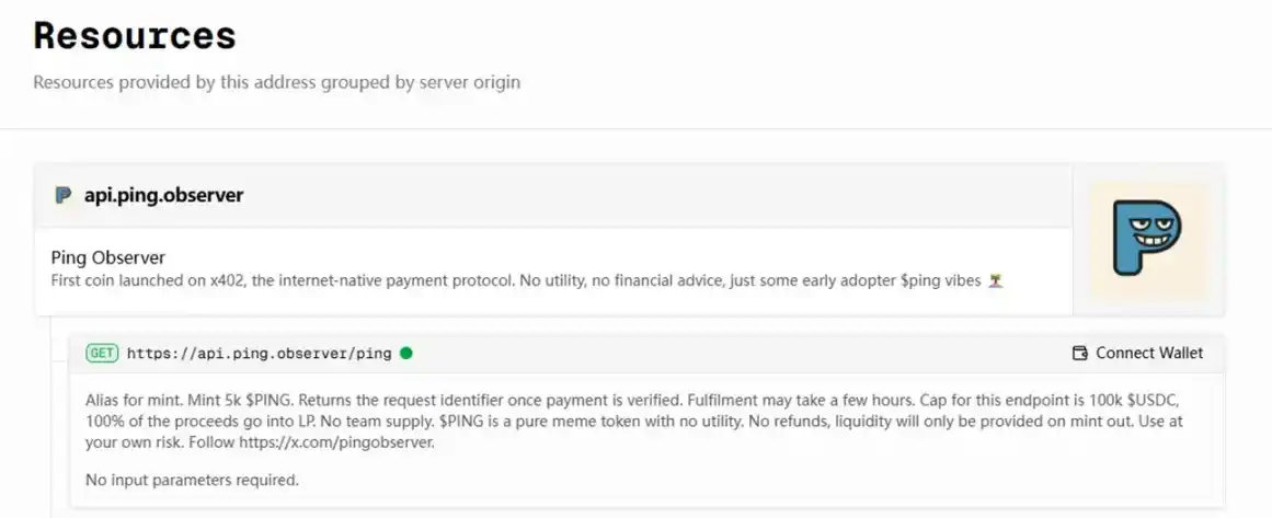 而现在 c402.market 试图让 PING 在 x402 生态中扮演类似的角色。