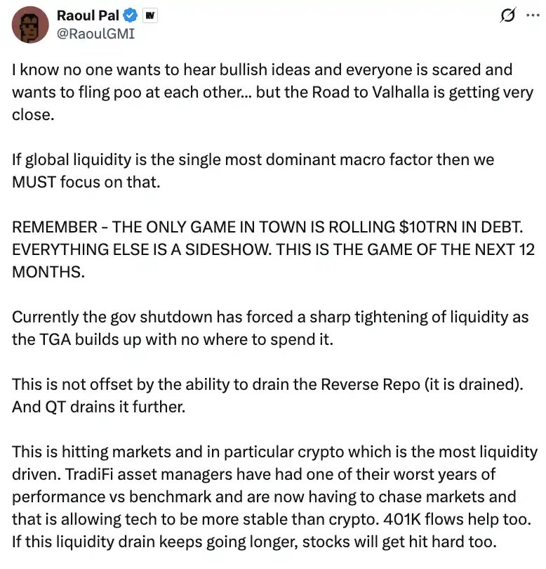 因此 Arthur 认为,目前加密市场的疲软只是流动性暂时被财政部锁住——政府停摆期间,财政部通过发债吸走了美元流动性,但尚未释放支出。当政府重新开门,这些资金重新流入市场,流动性将再次宽松。与此同时,市场会误以为这是顶点,从而抛售比特币,但那将是一个「重大误判」。真正的牛市将从「隐形 QE」开始的那一刻重新燃起。