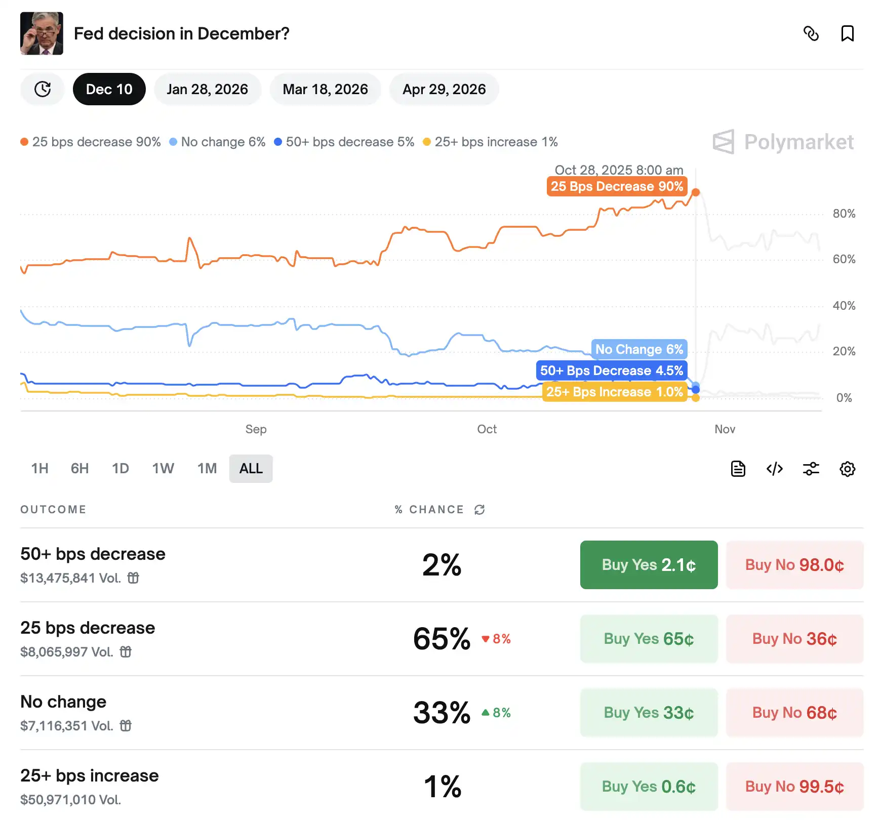 原本有 90% 胜率的 12 月 10 日美联储会议降息,目前在 Polymarket 上已经下降到了 65%(发文时为51%)。