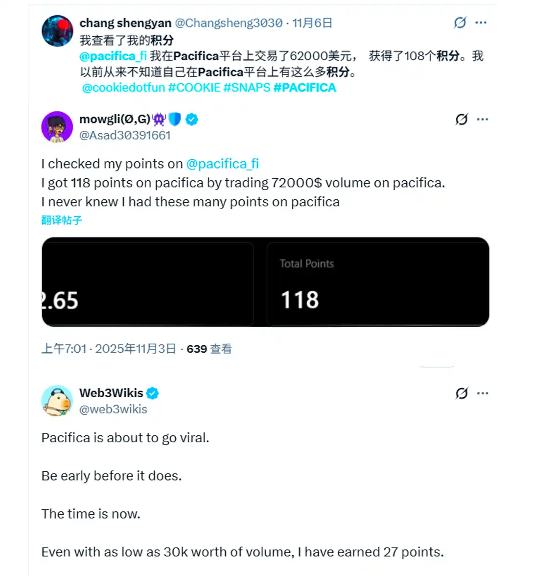 Pacifica 的积分计划于 2025 年 9 月 4 日启动,每周固定在周四 00:00 UTC 进行快照,24 小时内完成发放,将分配给符合条件的活跃用户,具体发放公式暂未公开,多以全平台用户交易量计算,当前每周会发放 10,000,000 积分给交易用户们(此前为 500,000 积分,已于 10 月 30 日上调至 20 倍),根据当周用户总数和交易量进行分配,因此积分的获得是动态的。
