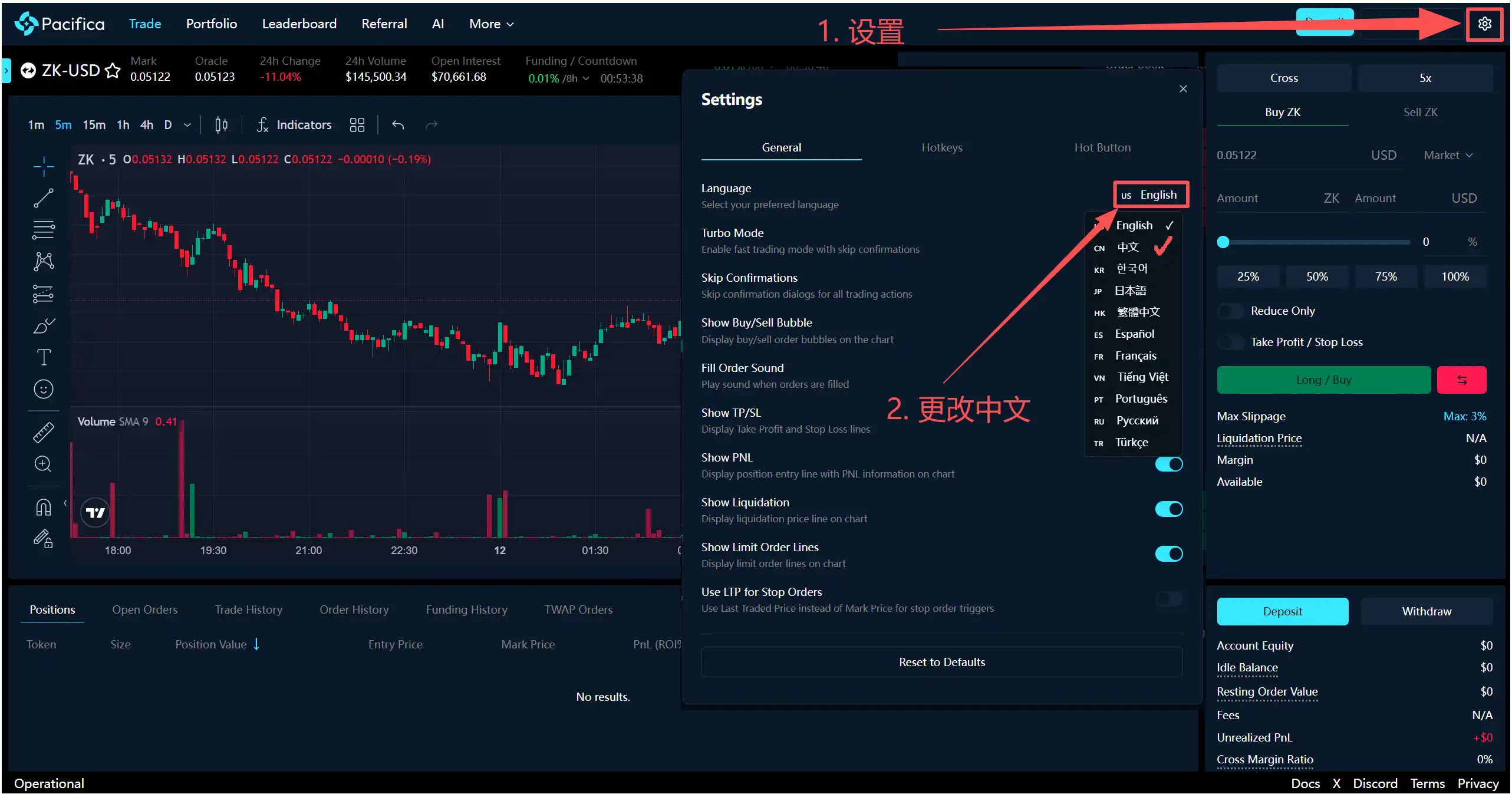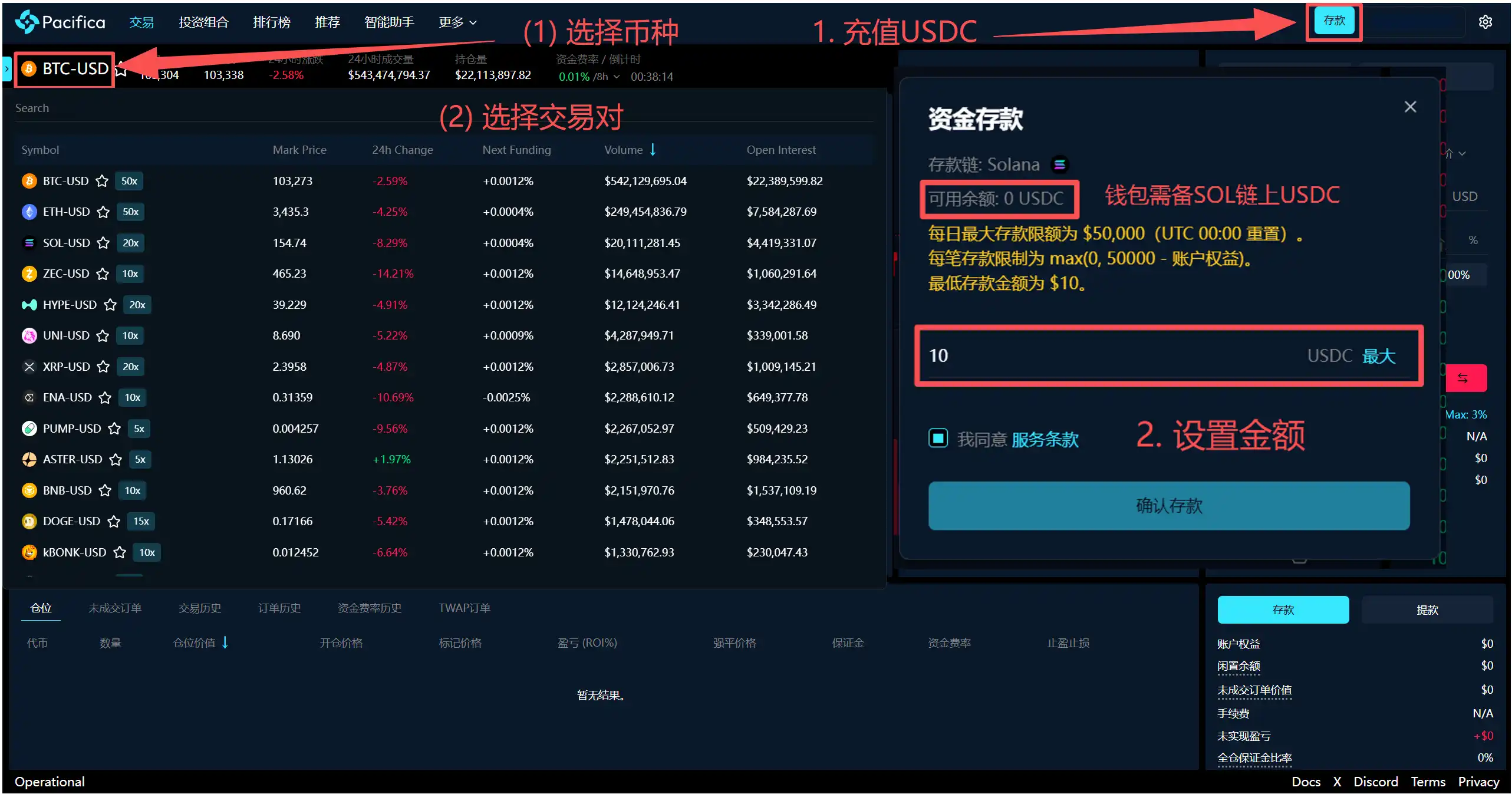 完成充值后,可以在左上角选择你想开单的币种,目前 Pacifica 支持多数主流代币,并且持续上线新代币中。