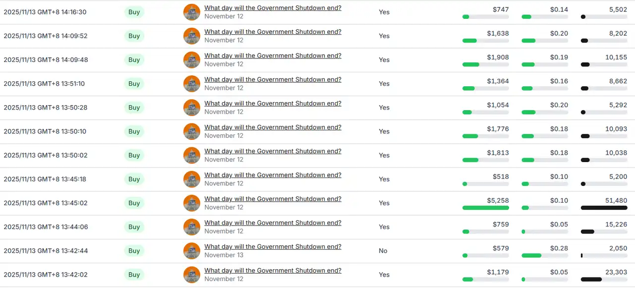 他意识到,这个市场赌的不是「关门实际何时结束」,而是「OPM 官网何时更新状态」,也预见到了行政延迟的可能性。于是,在 12 日晚上,当所有人都因新闻狂欢而把 no 的价格打到 0.07 美元时,他冷静地大量买入。当 OPM 网站在 13 日凌晨未能更新时,在 00:02 分,他以 0.99 美元的价格清仓离场,用微小的成本,换取了惊人的回报。
