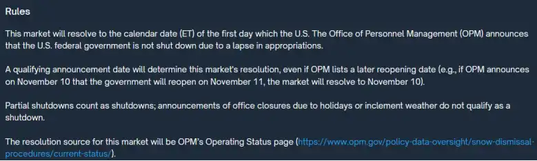 上图截自 Polymarket 该市场执行规则:以 OPM 官网首次宣布「联邦政府结束停摆」的日期(美东时间)为准。具体如下: