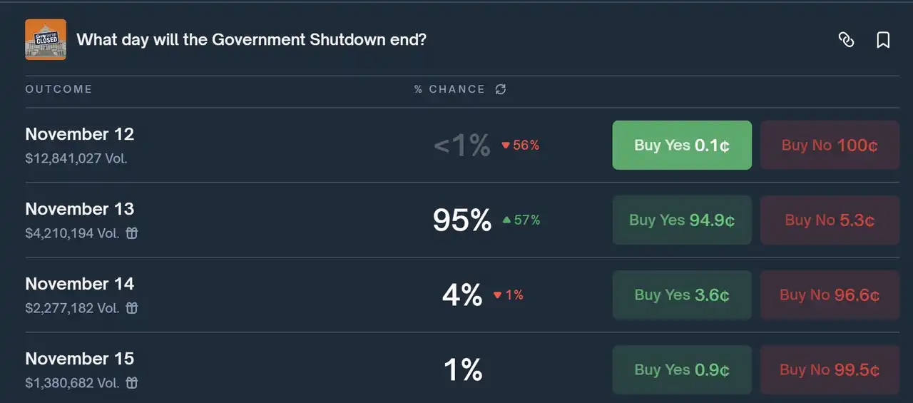 这种终极确定性事件像其他政治事件一样第一时间引爆了市场的强烈反应:Polymarket 上「关门于 11 月 12 日结束」的 Yes 份额价格一路飙升,最高冲到了 0.97 美元,在预测市场的逻辑里,这意味着市场共识认为此事已有 97% 的把握发生。因为最高只能到 1 美元,也就是 100% 的概率,0.97 买只能赚最后的 3%,但这 3% 是没有任何风险的稳赢,因为事件已经确定发生了。