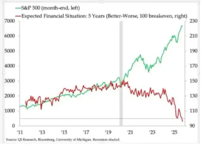 家庭收入预期两极分化。长期财务展望(如 5 年期预期)显示出惊人的差距:部分群体预期稳定或改善;另一部分则预期急剧恶化。