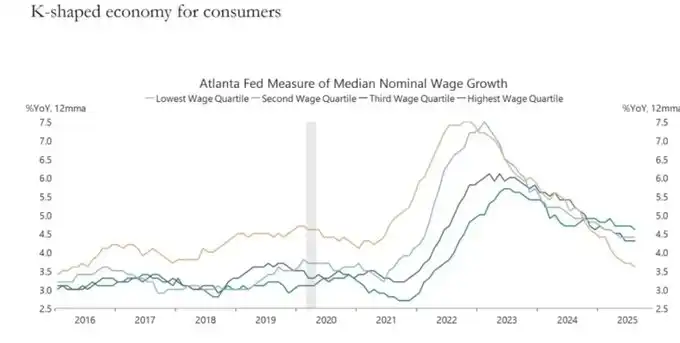 4. K 型经济正在固化为一个政治问题。对于越来越多的人口来说,社会契约不再可信;这种情绪最终将通过政策表达出来。