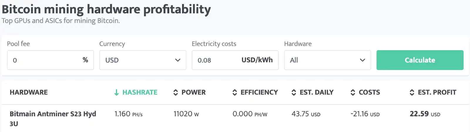 为了计算每日收益,我们将 Z15 Pro 的参数带入挖矿收益计算器,并按标准矿工设定: