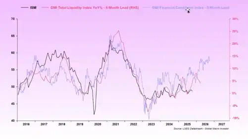 然后我用流动性作为核心驱动因素,因为它决定了债务融资。这里是到期的利息支付,这里是匹配它的流动性。这是美国的总流动性,包括美联储净流动性、银行和 M2。我发现金融条件(美元、利率、大宗商品)领先总流动性六个月,而总流动性又领先 ISM 三到六个月。所以我们有一个九个月的领先指标,暗示流动性应该回升,商业周期也会回升。这就是我一直使用的框架,它非常有效。