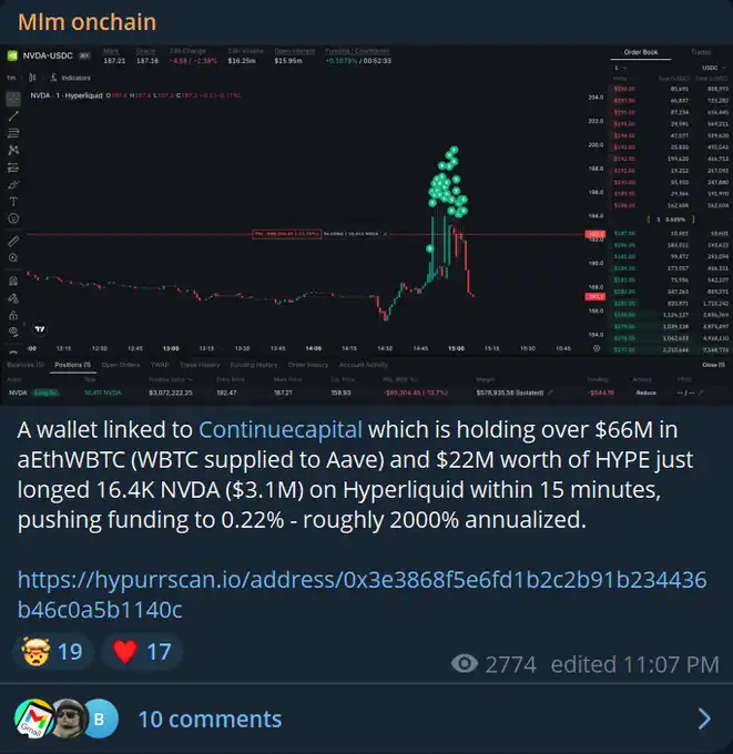 近期,Continue Capital 在 trade.xyz 上建立了 $3.1M 的 NVDA 多头头寸,直接将短期年化资金费率推高至惊人的 2000%,KOL 交易员 @CL207 抱怨道:「这家伙逼我放弃我的仓位,因为按每小时 0.2% 的收益率算,到周三我大概要付 20 万美元,这会让我破产」。