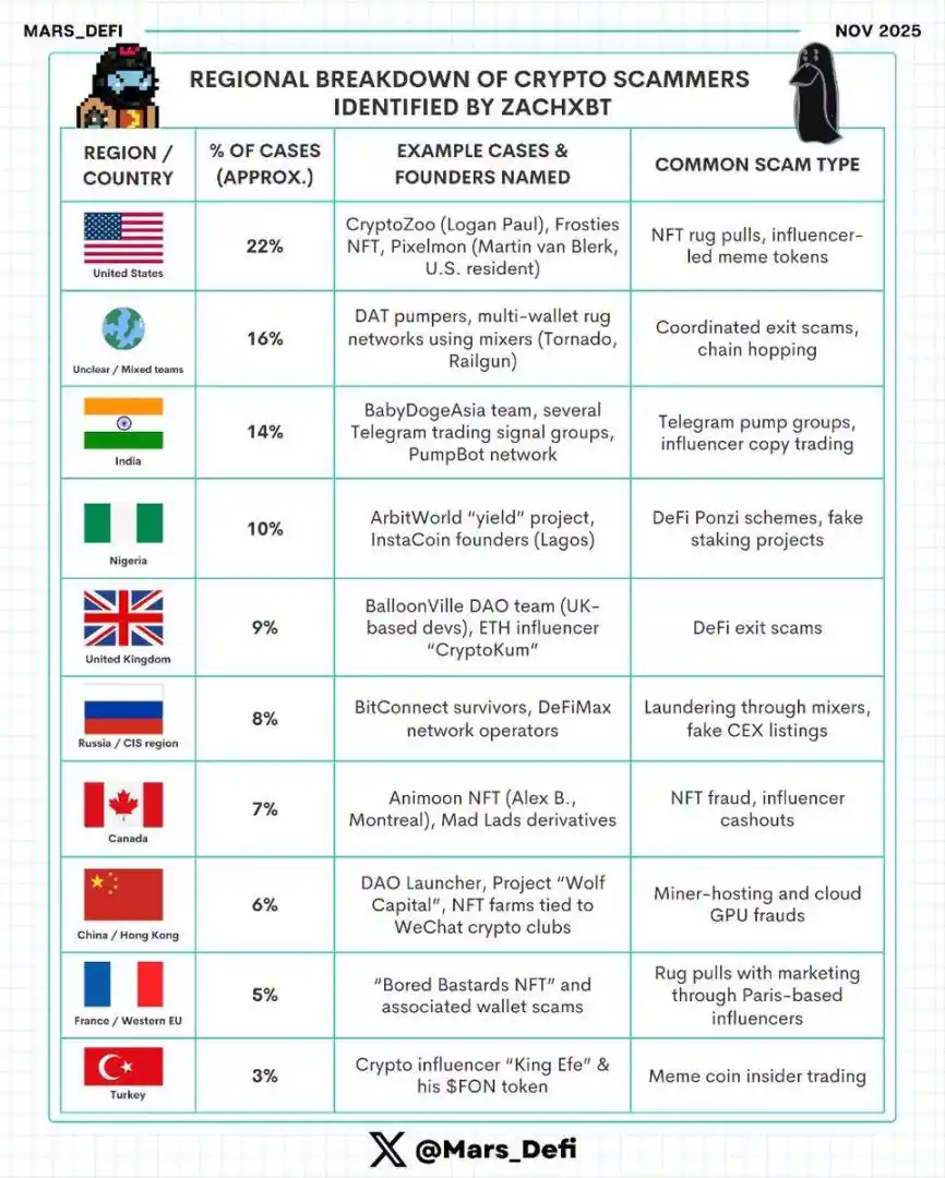 ZachXBT 识别的加密货币诈骗分子地区分布