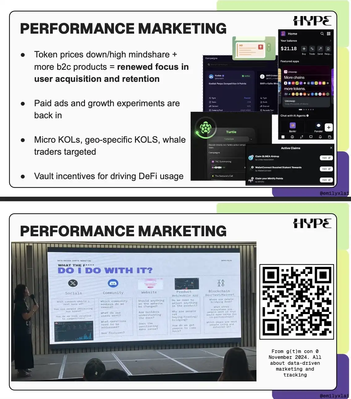 绩效营销正在回归,原因在于行业重新聚焦用户获取与留存。这意味着:安装追踪工具(链上、产品/网页、分发渠道);增长实验;付费与自然流量结合;从社交任务演变为流动性任务;精准 KOL 营销活动等