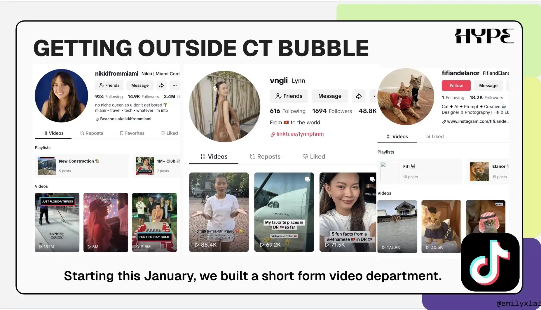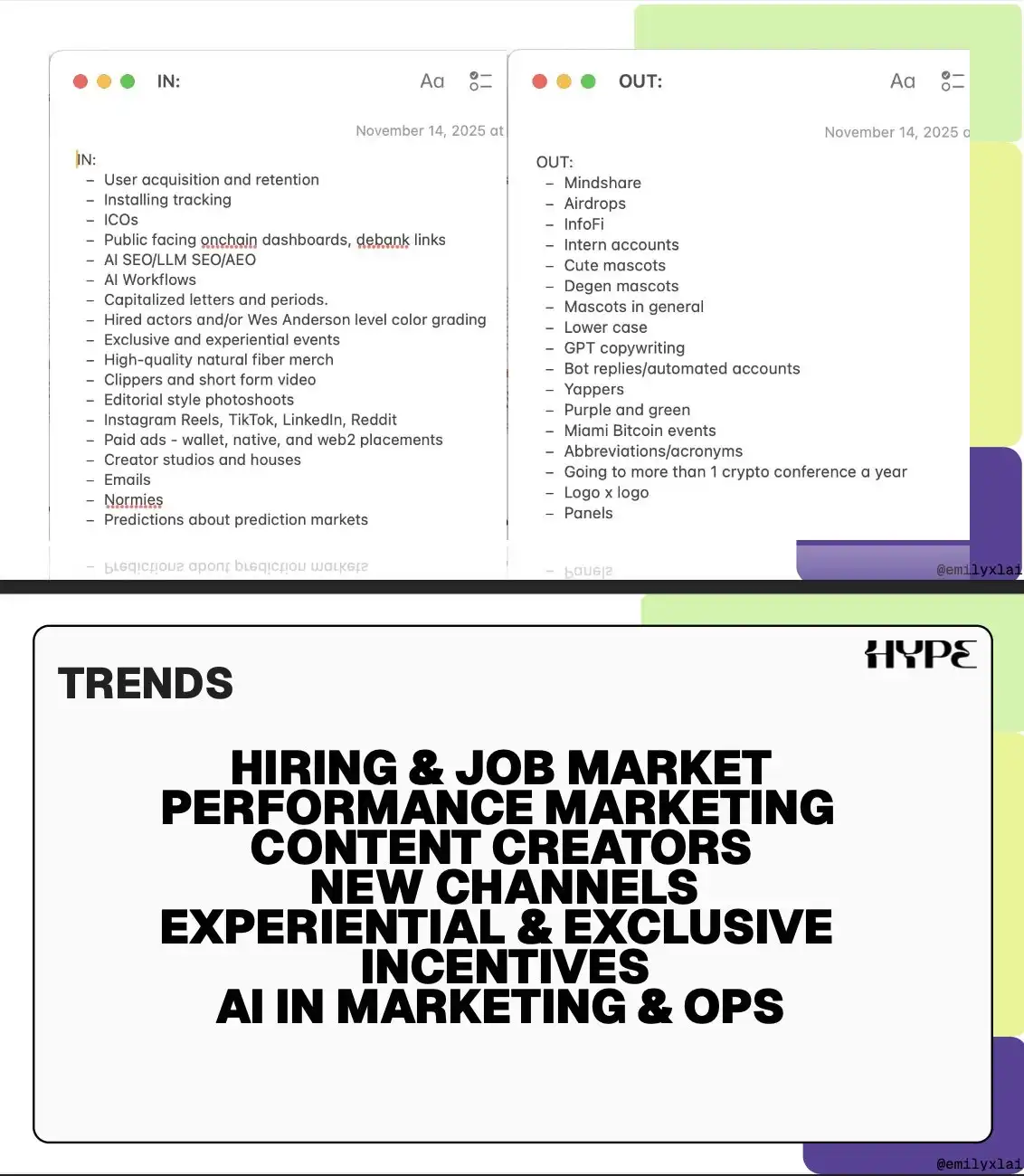 在 Hype (@hypepartners),我们在 DevConnect 周举办了 4 场内容创作者工作坊,并在今年 1 月引入 @web3nikki 领导新的短视频部门。内容将继续饱和,质量、深度和制作水平会变得更重要,同时走出 CT、触达新用户也同样关键。