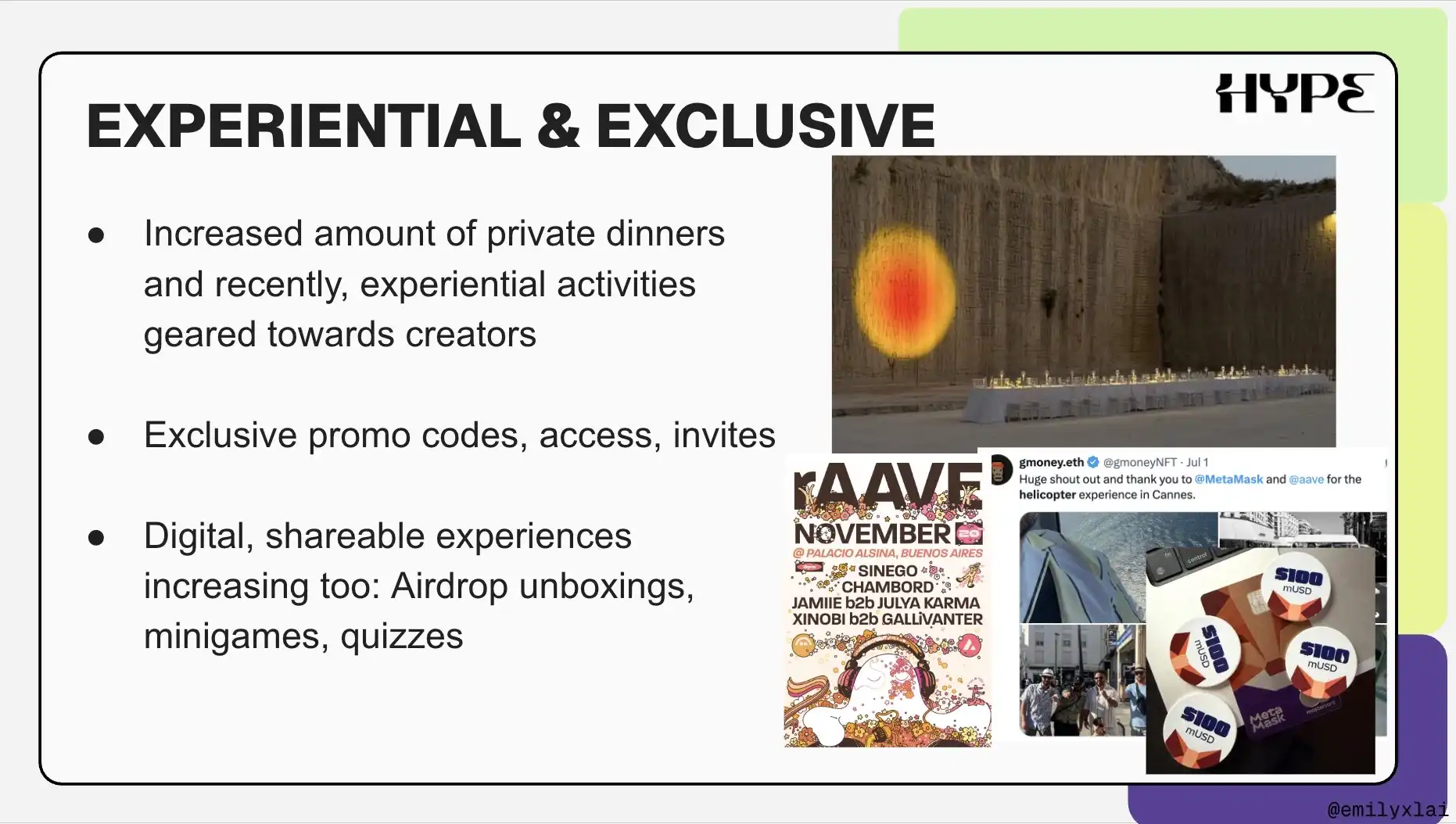 这种体验不仅发生在现实场景,还延伸到数字世界:空投开箱、小游戏、Buzzfeed 式性格测试等可分享的互动体验越来越多。我们看到越来越多灵感来自 Web2 品牌活动、快闪概念和网红事件,被引入加密领域。