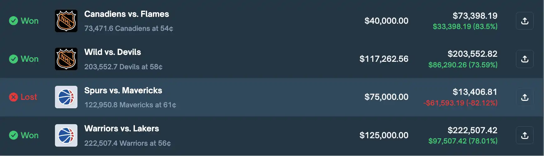这里也能够看出 Mayuravarma 的押注风格:其更倾向于盘前押注,下注金额从数千美元到数十万美元不等,且极少在盘中卖出。这既成为了其能够在早期凭借小资金一步步滚仓赚到大结果的原因,也为后续上头 ALL IN、一把梭哈 NHL 比赛妄图翻盘终遭反噬埋下了伏笔。