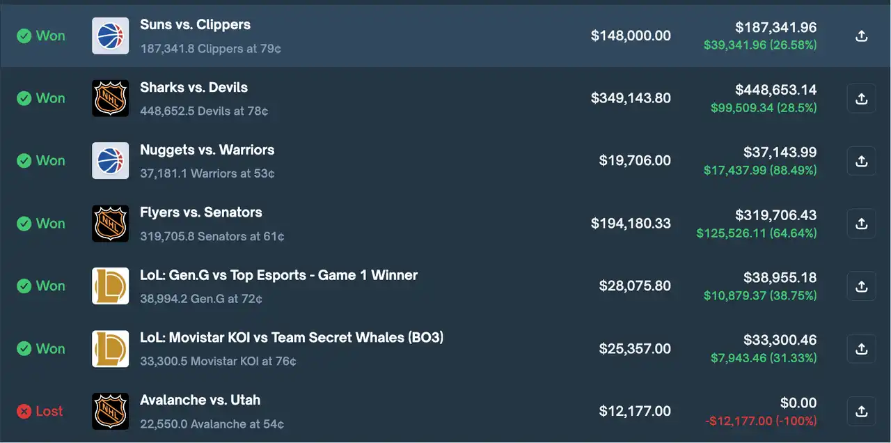 之后的押注事件结果看起来稍显无聊,但其中过程对于 Mayuravarma 称得上是一切顺利。其在 LOL 比赛、NHL 比赛、NBA 比赛中整体保持着较高胜率,而从这些比赛押注界面我们也能看到其另一押注风格:更倾向于押注赛前赢面更高、实力更强的队伍,而非寄希望于爆冷反转。这在一定程度上反映了 Mayuravarma 对各类体育赛事的深度关注和了解,同时也为其持续盈利提供了一定的保障,但也为比赛爆冷留下了一定的隐患。