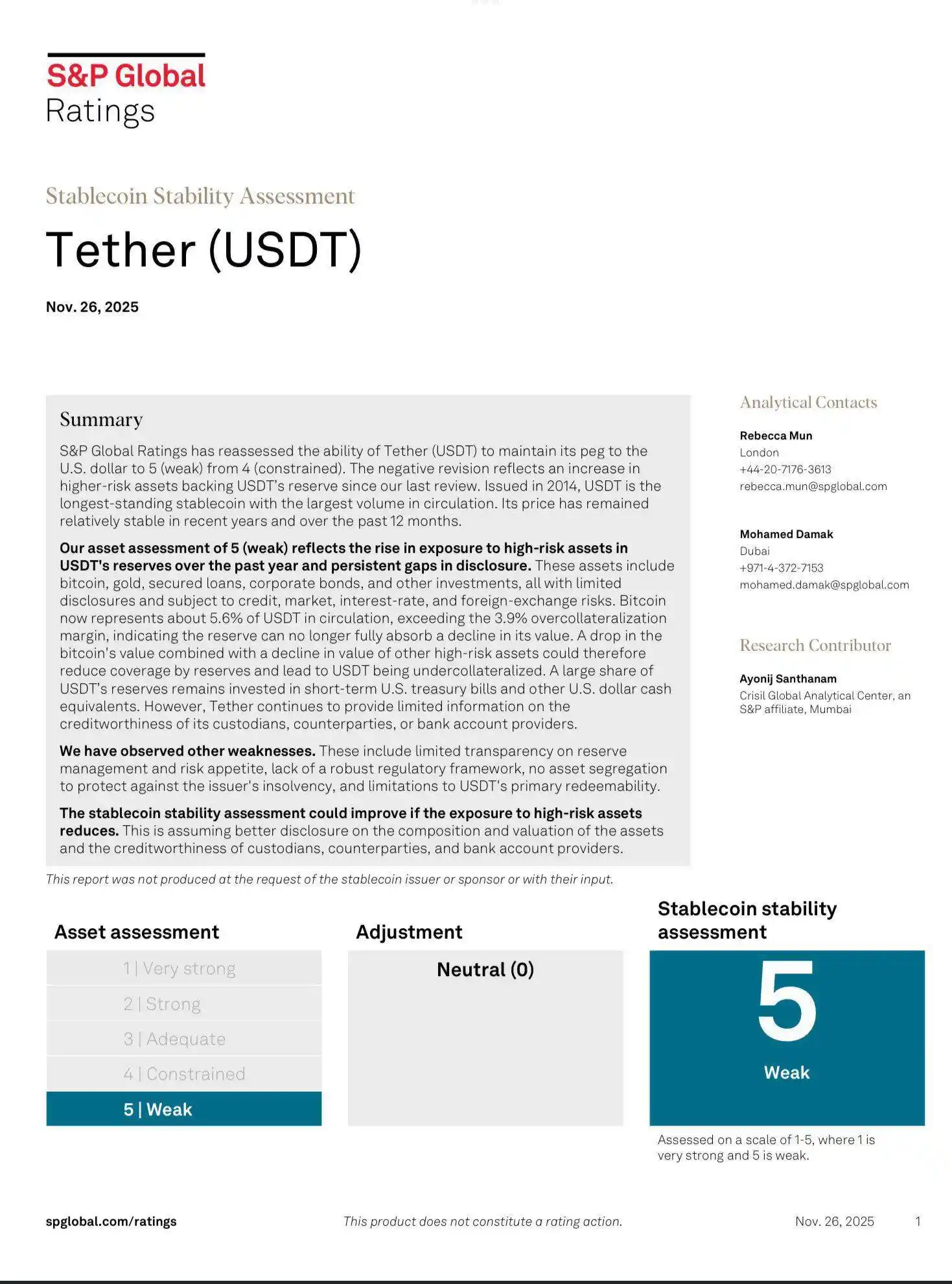 美东时间 11 月 26 日,顶级评级机构标普国际(S&P Global)宣布将稳定币巨头 Tther(USDT)的评级结果从「4」(受限)下调至「5」(脆弱),即该评级体系下的最低等级。