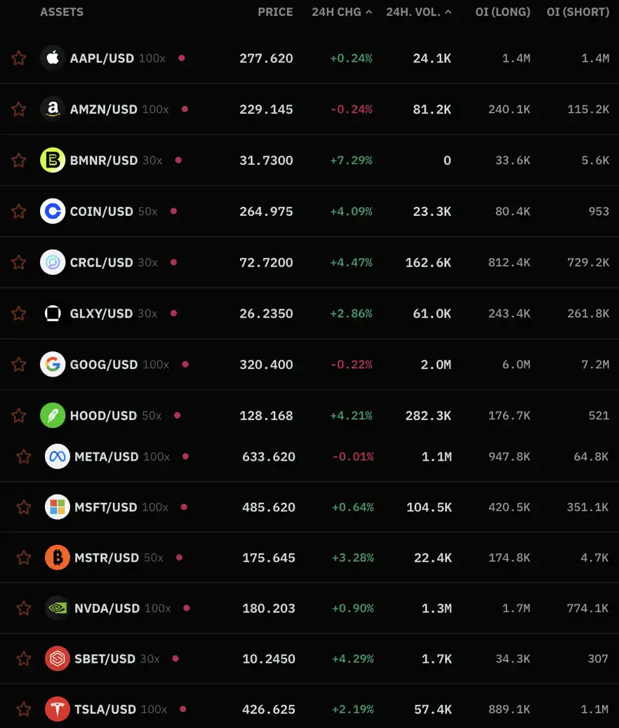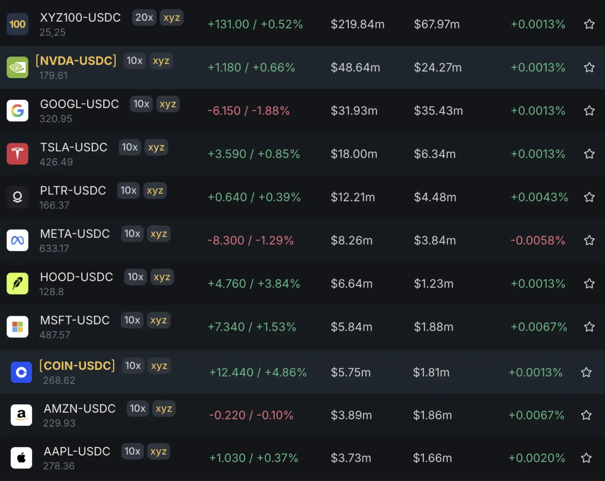 包括加密行业里各大 Perp DEX 像是 Hyperliquid、Trade.xyz、Ostium、Lighter 都已经上线了美股的永续合约交易。
