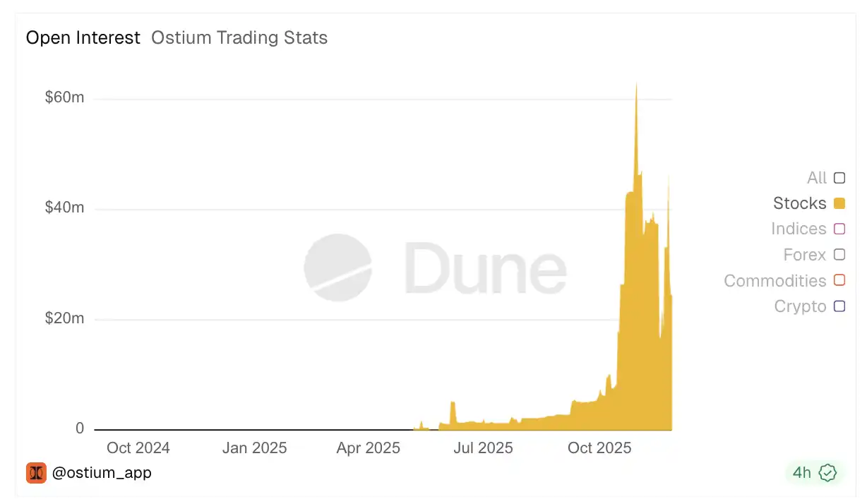根据 Dune 上的 Ostium 关于美股合约交易的数据统计,目前单日美股合约交易量已经突破 5000 万美元。美股合约交易的 OI(未平仓量)曲线则在今年 10 月达到了历史峰值,约 6400 万美元,而现在回落到 4500 万美元左右。在 OI 上也能看出 Ostium 的美股合约未平仓量占比总未平仓量的 20%。