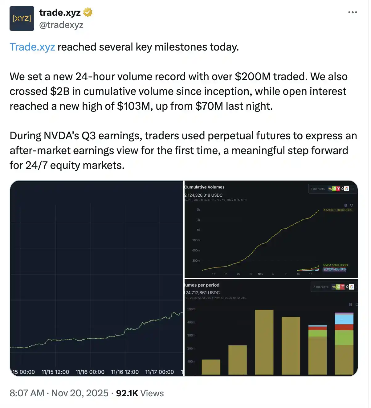 美股永续合约的 PMF 已经得到初步验证。数据显示,trade.xyz 的累计交易量已突破 20 亿美元,NVDA 财报发布期间更是创下了单日 2 亿美元的交易记录,过去 24 小时交易量约为 7.34 亿美元。