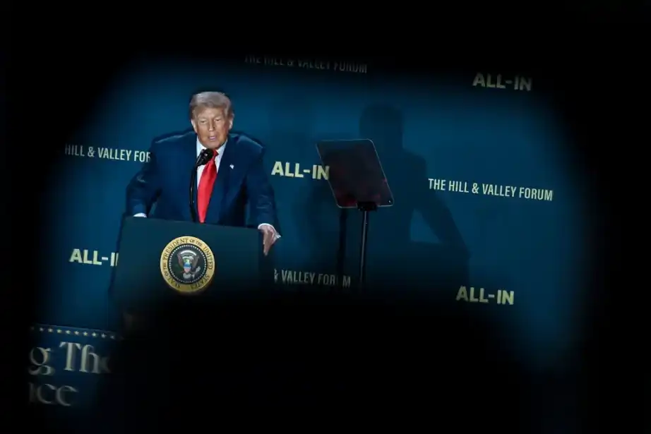 特朗普总统于七月在华盛顿一次人工智能峰会上发言,该峰会由科技播客「All-In」及科技会议「Hill & Valley Forum」的组织者共同主办。图片来源:Kenny Holston/The New York Times