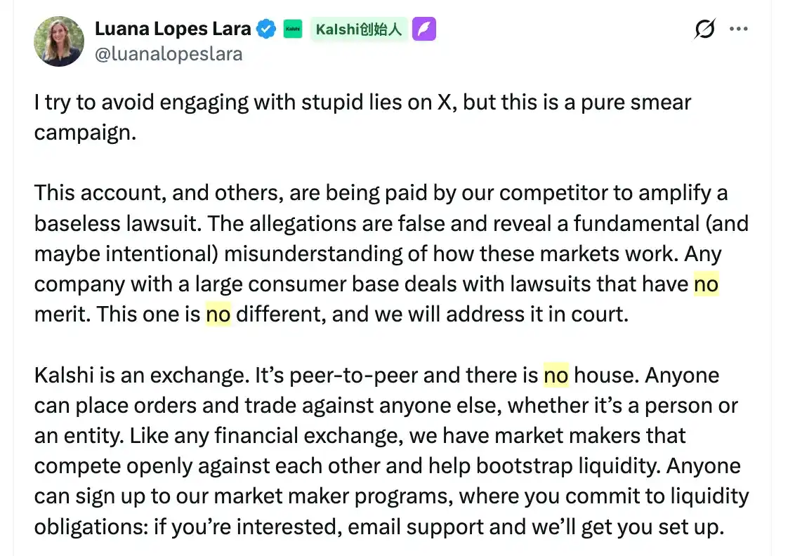 面对指控,Kalshi 联合创始人 Luana Lopes Lara 迅速反击,称诉讼是「基于对衍生品市场机制的根本性误解」。她的辩护逻辑符合标准金融市场的常识: