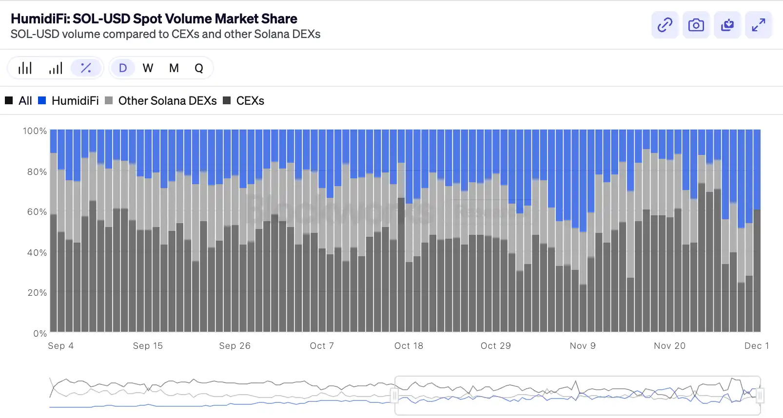 目前,HumidiFi 已成为了 Solana 链上实际交易量最大的去中心化交易平台(DEX),日均处理交易额超 10 亿美元——约占 Solana 全部现货 DEX 交易活动的 35%,Solana 每日收入的约 4% 都来自这些交易。