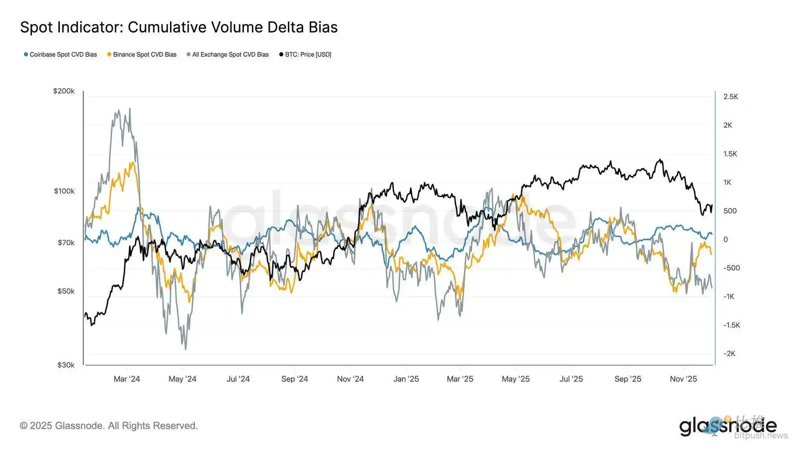 在 ETF 需求恶化的基础上,累计交易量差(CVD)在主要交易平台也已回落,Binance 和聚合交易平台都持续呈负面趋势。