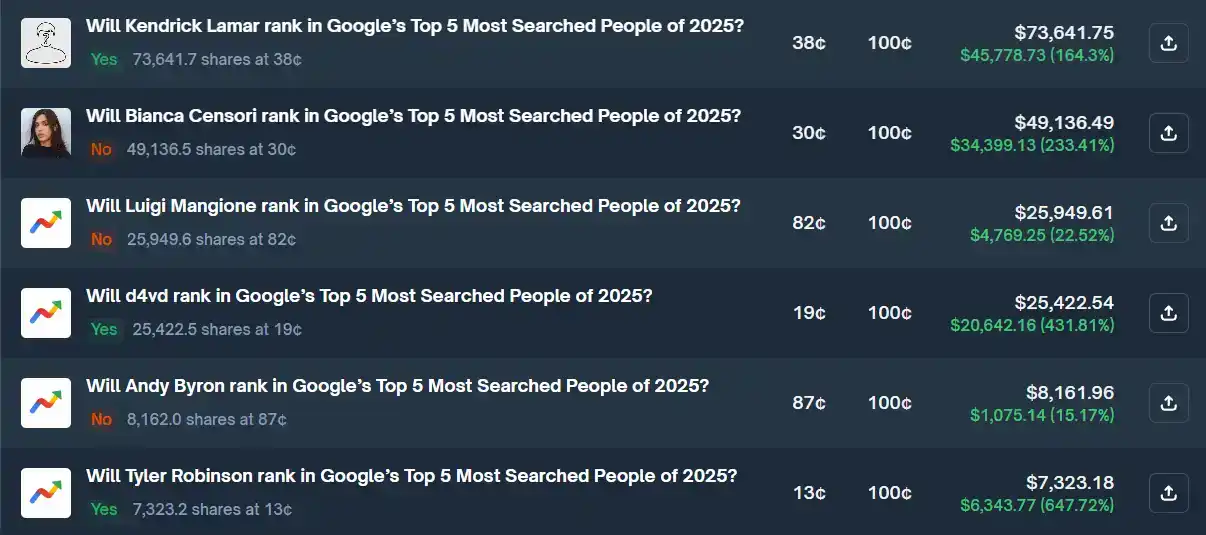 在谷歌何时公布热搜榜完全未知的情况下,这名交易员在前天突然开始大规模建仓。他不是买热门人物的「是」,而是疯狂扫入他们的「否」。