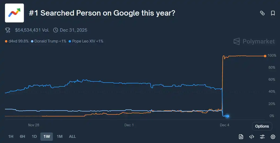 然而,就在他扫完单不到几个小时,谷歌突然发布了年度热搜榜单。当排名公布的一瞬间,整个市场都集体愣住了——榜首既不是教皇,也不是特朗普,更不是任何一个热门选项,而是那个长期概率接近零、交易员连资料都懒得查的名字:d4vd。
