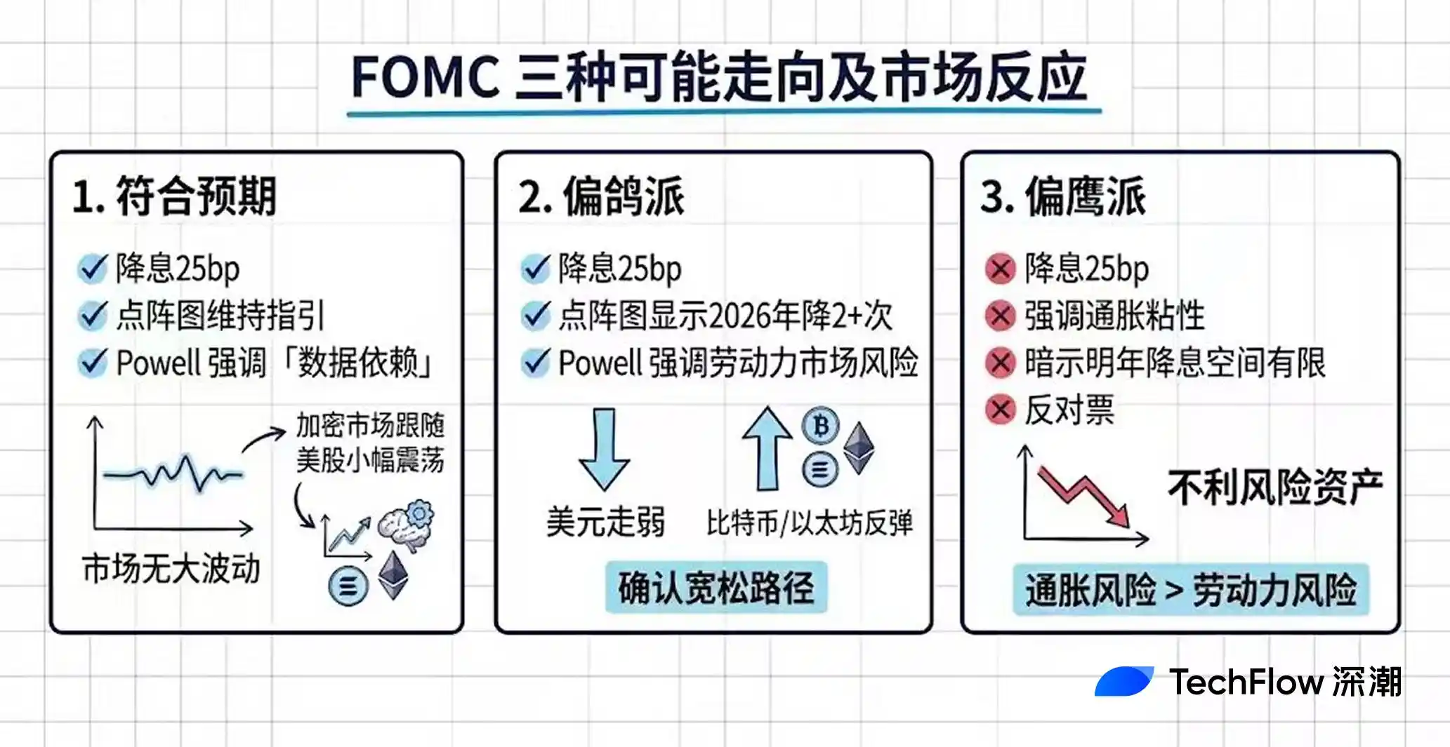2. 次可能的情况是「偏鸽派」:降息 25bp,但点阵图显示 2026 年可能降 2 次甚至更多,Powell 措辞偏软,强调劳动力市场风险大于通胀风险。