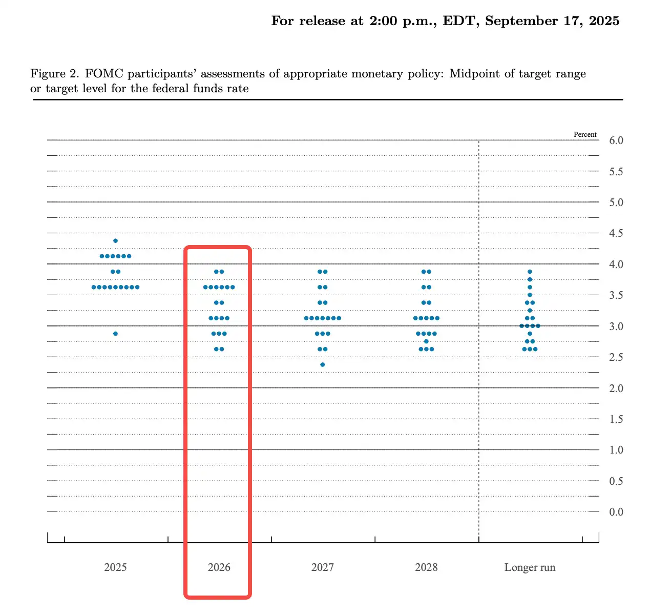 从图中可以看到,2025 年那一列的点主要集中在两个区域:3.5%-3.625% 附近有大约 8-9 个点,3.75%-4.0% 附近也有 7-8 个点。这说明委员会内部分成了两派: