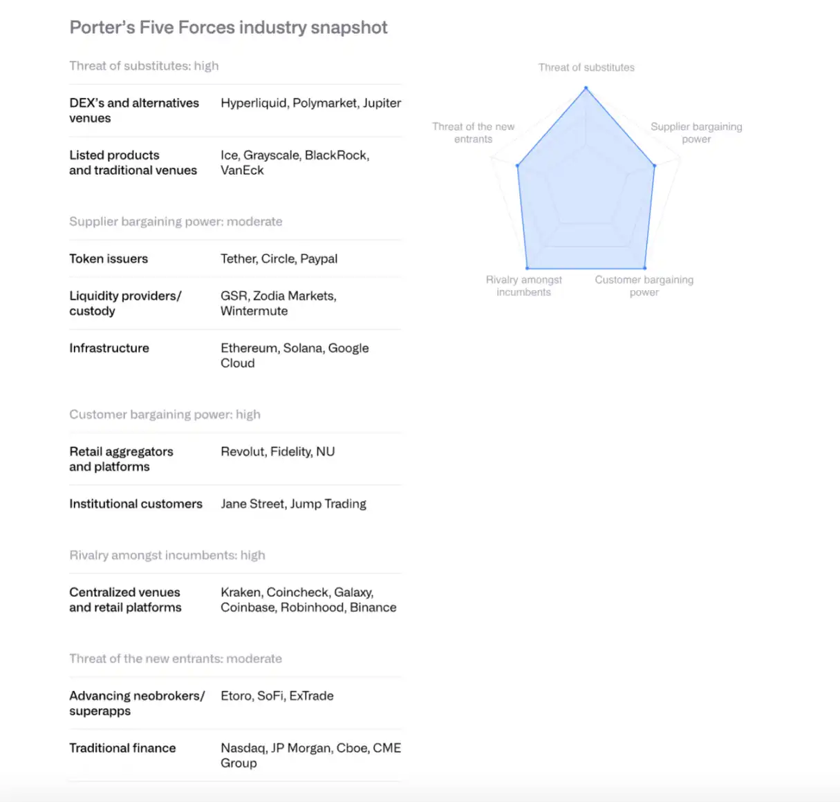 替代品威胁:Hyperliquid 等去中心化交易平台、Polymarket 等预测市场、CME 加密衍生品构成竞争。