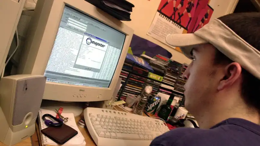 一名纽约大学学生在纽约下载 Napster 网站上的音乐文件。2003 年 9 月 8 日,美国唱片业协会(RIAA)对 261 名通过互联网下载音乐文件的文件共享者提起诉讼;此外,RIAA 还向互联网服务提供商发出了 1500 余份传票