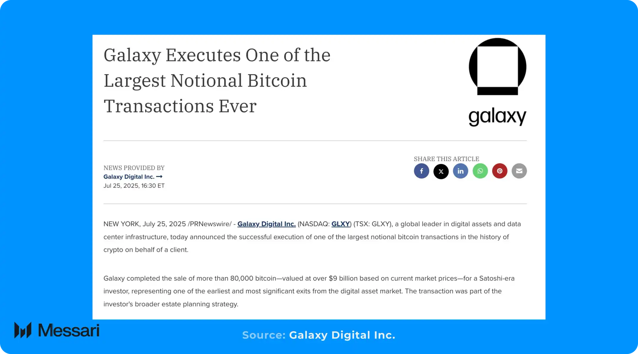今年早些时候,Galaxy Digital 协助一位「中本聪时代」的投资者完成了 8 万枚 BTC 的出售。这一笔交易就占到了比特币总供应量的约 0.38%,且全部来自单一主体。