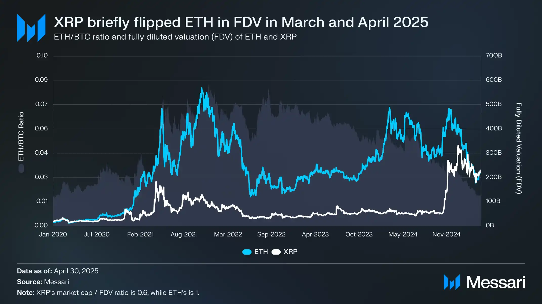 这场争论似乎在今年上半年达到了高潮。3 月份,XRP 一度在完全稀释估值(FDV)上超过了 ETH(需要注意的是,ETH 已实现完全流通,而 XRP 目前仅约 60% 的供应量处于流通状态)。