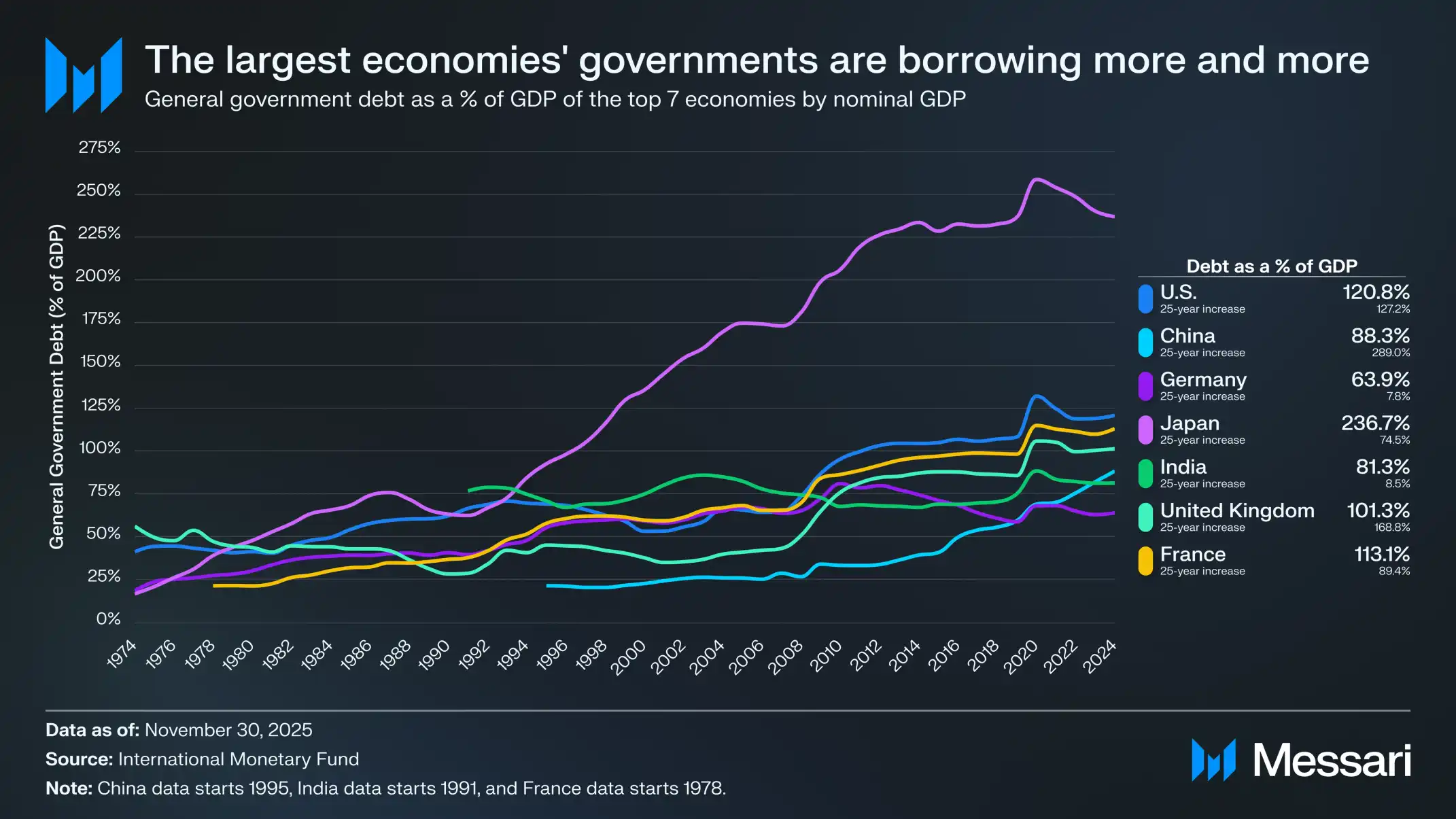 在过去四分之一个世纪里,全球主要经济体的政府债务相对于 GDP 的水平普遍大幅上升。作为全球体量最大的两个经济体,美国与中国的一般政府债务占 GDP 的比例,分别增长了 127% 和 289%。无论政治体制如何、增长模式如何变化,政府债务持续扩张已经成为全球金融体系的一种结构性特征。
