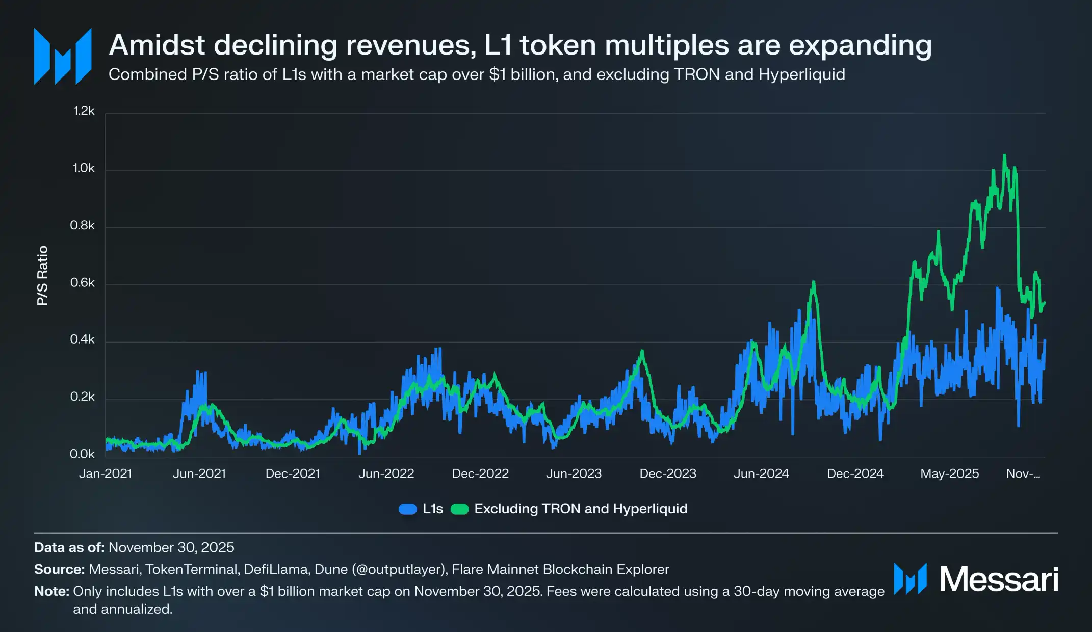 L1 的估值正日益脱离其基本面。L1 收入同比显著下滑,其估值越来越建立在「货币溢价」的假设之上。除少数例外,我们预计大多数 L1 的表现将跑输 BTC。
