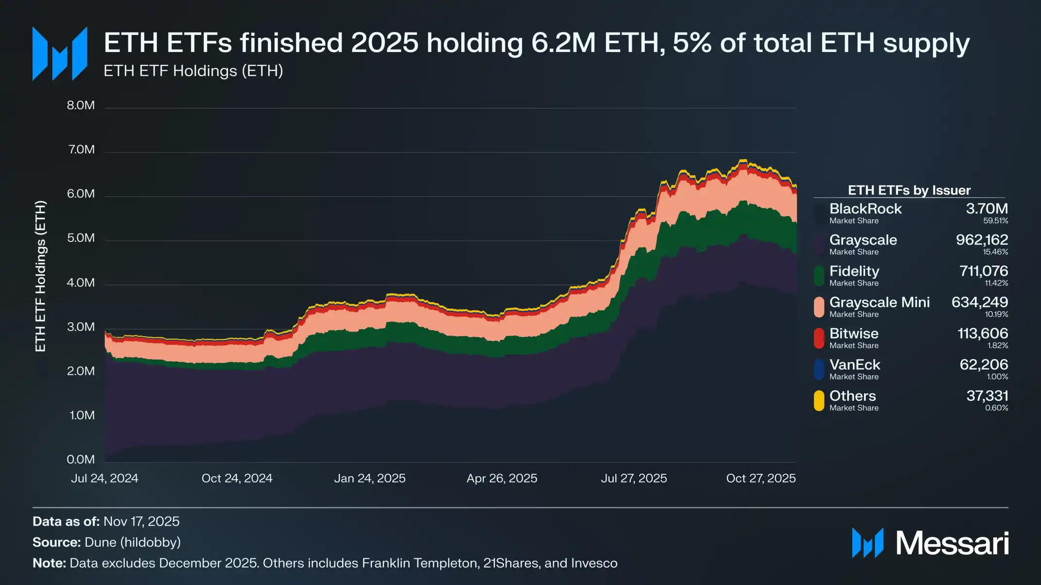 整体而言,现货 ETH ETF 在年末合计持有 620 万枚 ETH,约占 ETH 总供应量的 5%。