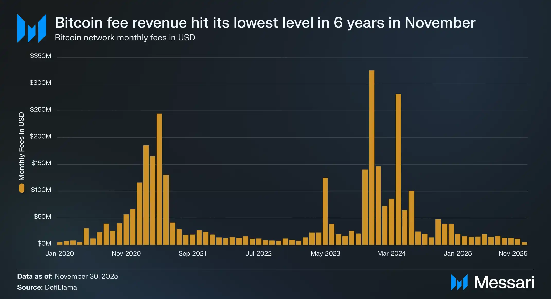 一度,在 Ordinals 与 Runes 热度飙升的背景下,市场似乎看到了一个可能性:仅靠交易手续费,也许就足以补偿矿工、维持网络安全。2024 年 4 月,比特币链上手续费收入达到 2.814 亿美元,创下历史第二高的月度水平。然而,仅仅一年半之后,手续费收入却出现了断崖式下滑。事实上,2025 年 11 月的链上手续费仅为 487 万美元,创下自 2019 年 12 月以来的最低月度水平。