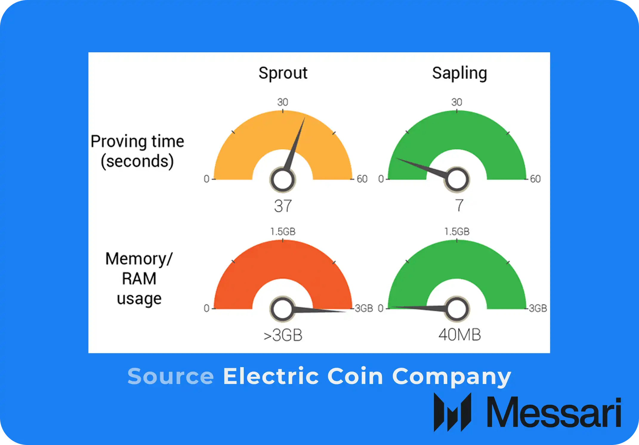 Sapling 升级将内存需求降低了 97%(至约 40 MB),并将零知识证明的生成时间缩短了 81%(至约 7 秒),为在移动设备上实现隐私交易铺平了道路。