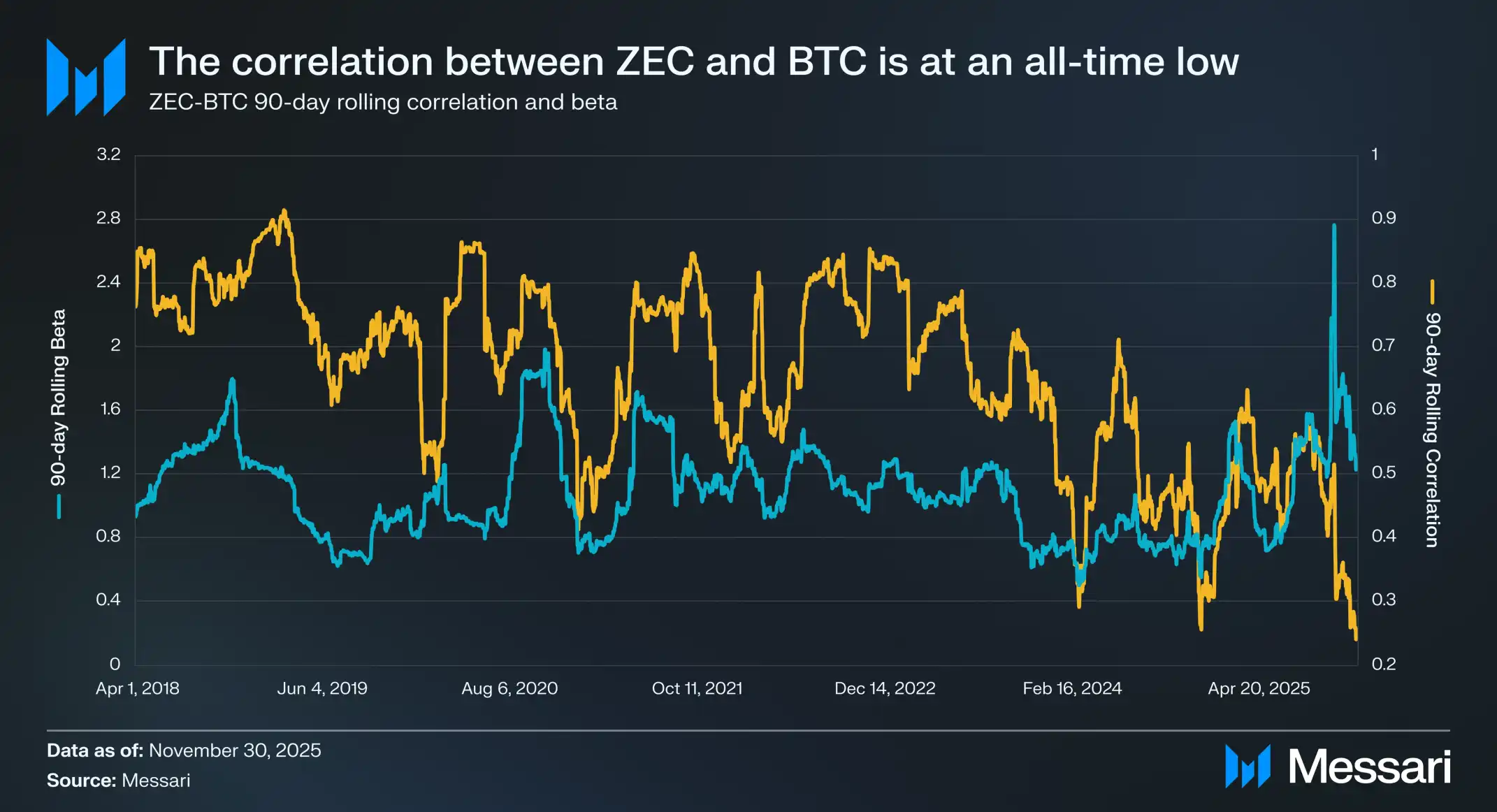 自 2019 年以来,ZEC 与 BTC 的滚动相关性呈现出明确的下行趋势,从一度高达 0.90 降至近期的 0.24 低位。与此同时,ZEC 相对 BTC 的滚动贝塔却升至历史新高,这意味着:在两者相关性下降的同时,ZEC 反而在放大 BTC 的价格波动。这种背离现象表明,市场正在开始为 Zcash 的隐私保障赋予一种独立的、特有的溢价。