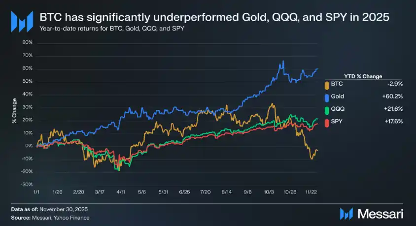 但事实并非如此。年初至今,黄金(XAU)上涨约 60%,SPY 上涨 17.6%,QQQ 上涨 21.6%,而 BTC 却下跌了 2.9%。考虑到 BTC 的体量远小于黄金和主要股票指数、且波动性更高,2025 年其相对于这些基准资产的明显跑输,不可避免地引发了市场对其货币叙事的合理质疑。