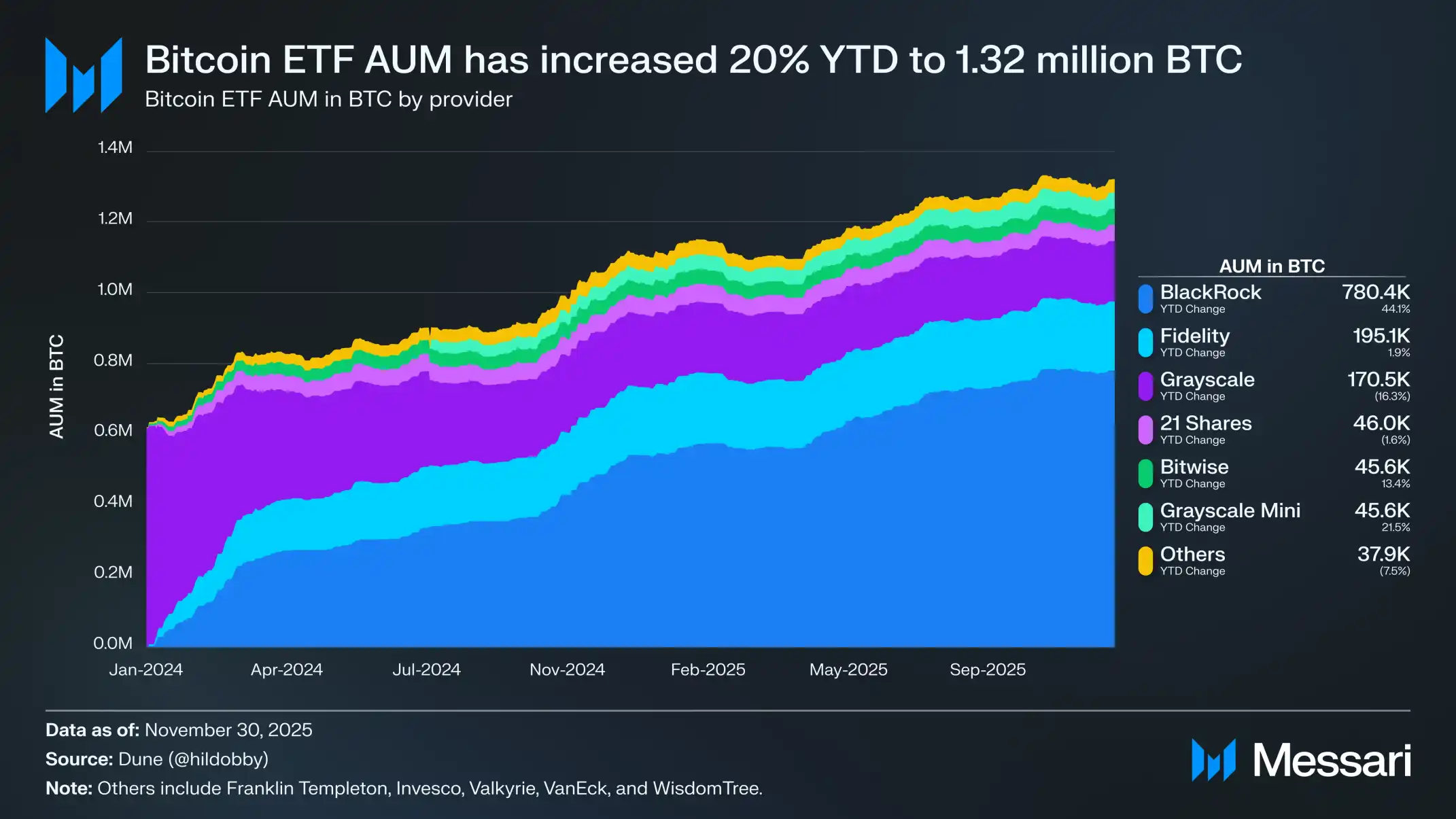 2024 年 ETF 上市所带来的动能,几乎无缝延续到了 2025 年。截至目前,比特币 ETF 的总资产管理规模(AUM)年初至今增长约 20%,持仓量从约 110 万枚 BTC 提升至 132 万枚 BTC。按当前价格计算,这相当于 超过 1,200 亿美元 的比特币被这些产品所持有,占 BTC 最大发行量的 6% 以上。