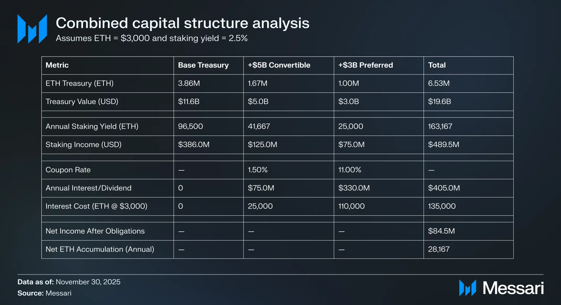 例如,像 BitMine 这样的 DAT,可以发行低票息的可转换债务与更高收益率的优先资本,并将所募集的资金直接用于购买 ETH,同时对这些 ETH 进行质押以获取持续性收益。在合理假设下,质押收入可以部分对冲固定的利息与分红支出,使金库在市场环境有利时,既能持续增持 ETH,又能提高资产负债表杠杆。