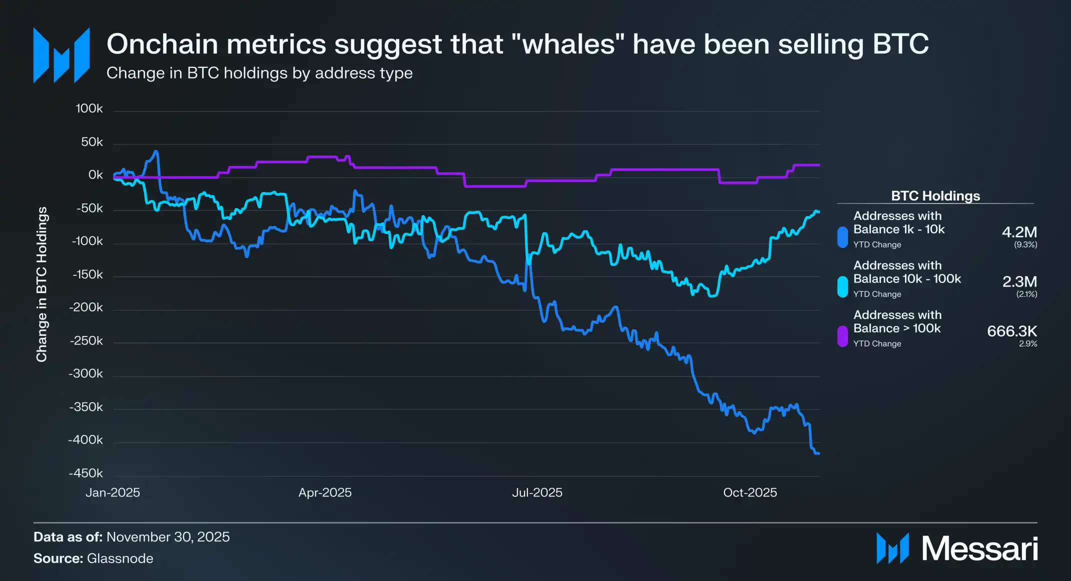 比特币的链上指标也呈现出相似的趋势。2025 年以来,一些持币规模最大、存续时间最长的地址——即持有 1,000 至 100,000 枚 BTC 的地址——整体上持续处于净卖出状态。这些地址在年初合计持有约 690 万枚 BTC,接近比特币流通总量的 三分之一,并在全年持续向市场释放筹码。