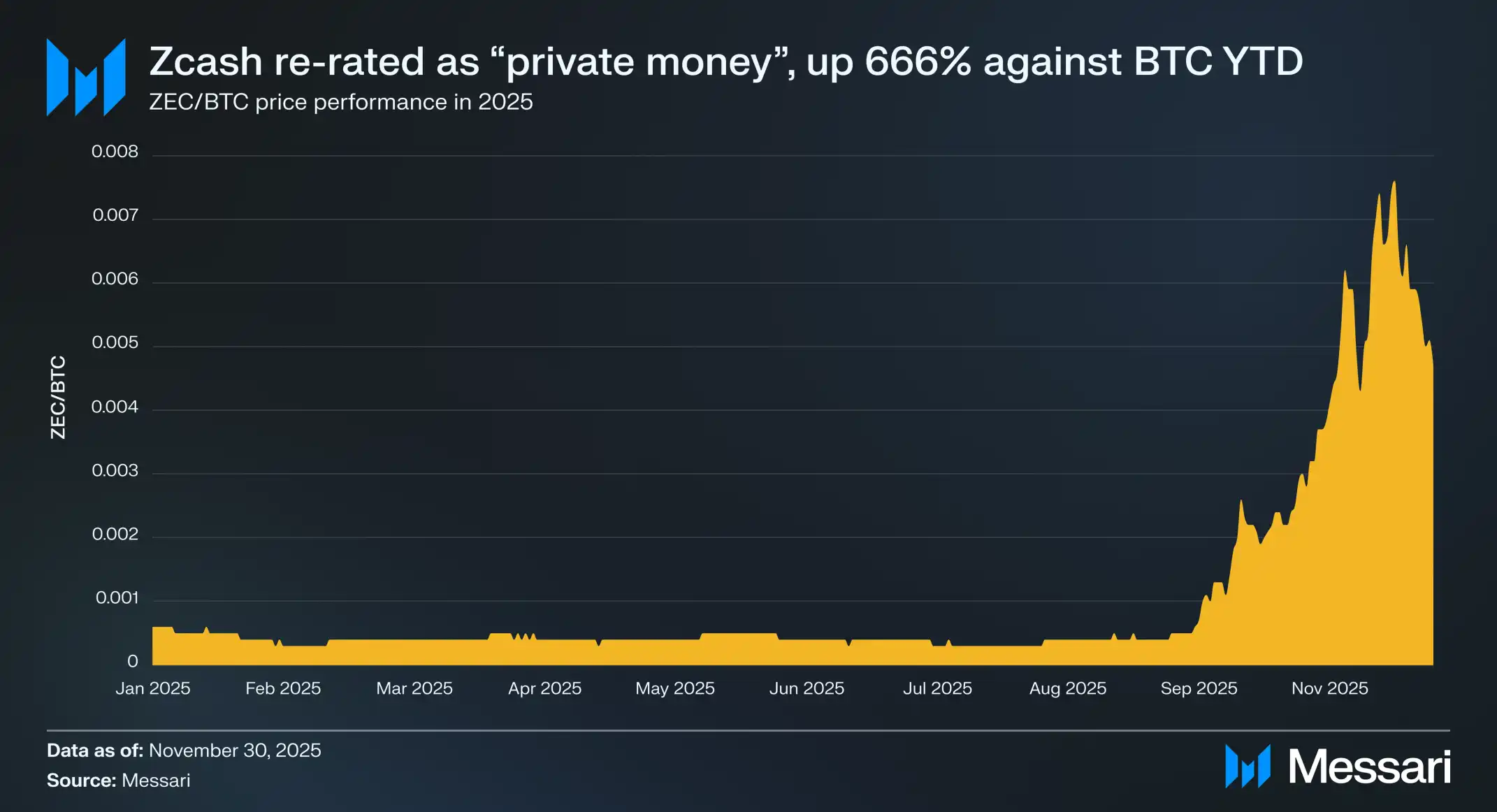 在 BTC 与 ETH 之外的所有加密资产中,ZEC 在 2025 年的货币认知转变最为显著。多年来,ZEC 一直游离于 cryptomoney 的核心层级之外,被视为一种小众的隐私币,而非真正的货币资产。然而,随着对监控的担忧加剧以及比特币的机构化进程加速,隐私重新被视为一种核心的货币属性,而不再只是边缘化的意识形态偏好。
