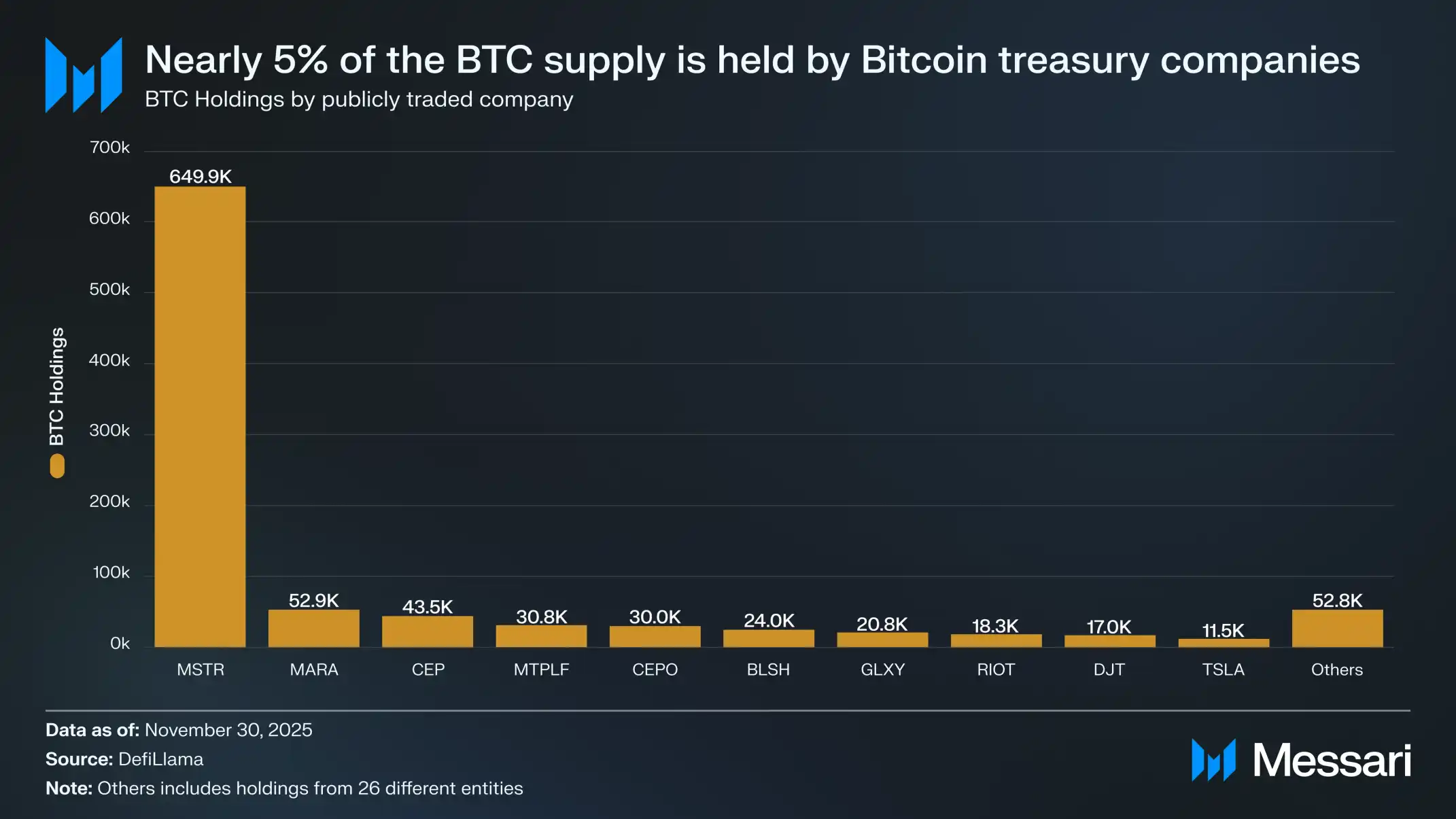 此外,机构参与早已不再局限于 ETF。数字资产金库公司(DATs)在 2025 年成为重要买方,进一步强化了 BTC 作为企业级储备资产的角色。尽管 Michael Saylor 领导的 Strategy 长期以来是企业囤积比特币中最具代表性的案例,但目前全球已有近 200 家公司在资产负债表中持有 BTC。