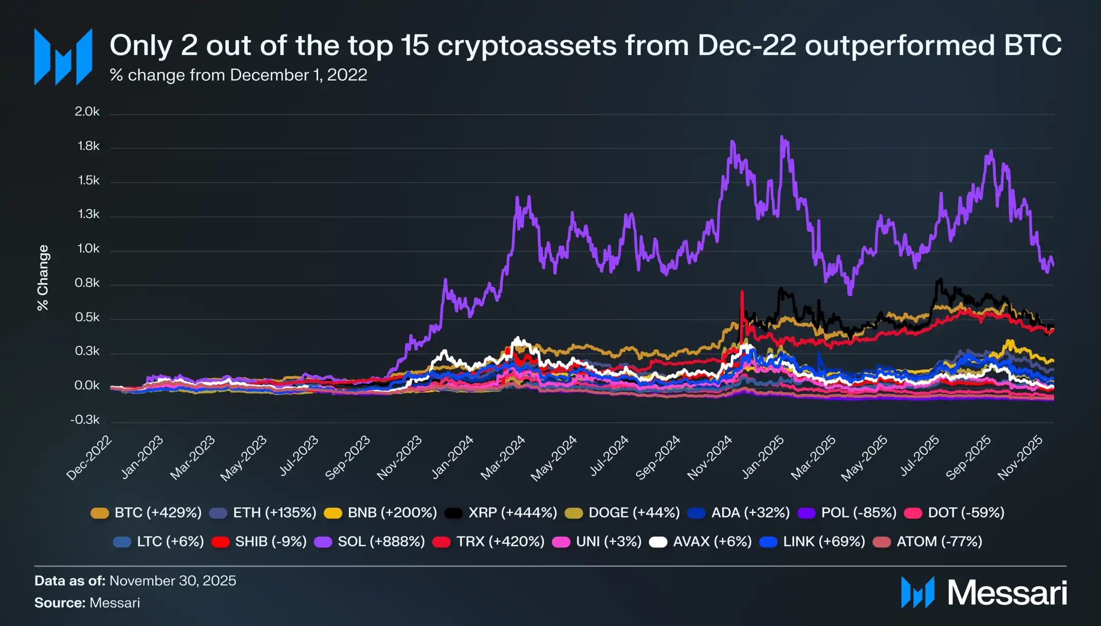 在 2022 年 12 月 1 日 当时市值排名前十五的加密资产中,只有两种资产(XRP 和 SOL)在这一阶段跑赢了 BTC,而且真正实现显著超额收益的,只有 SOL(上涨 888%,相比之下 BTC 为 429%)。